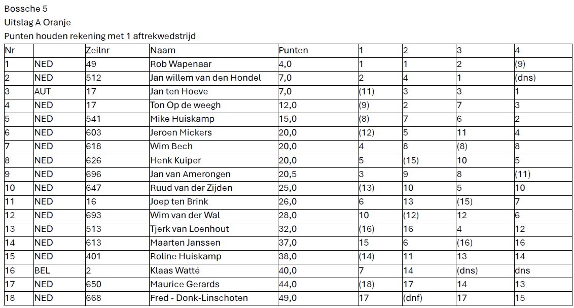Winst was er voor koning Zonderwind Rob Wapenaar voor Jan Willem van den Hondel, Jan -welkom terug- ten Hoeve, Ton op de Weegh en Mike Huiskamp in een mooi veld van maar liefst 18 Olympiajollen. Eindstand; zie de laatste foto.
