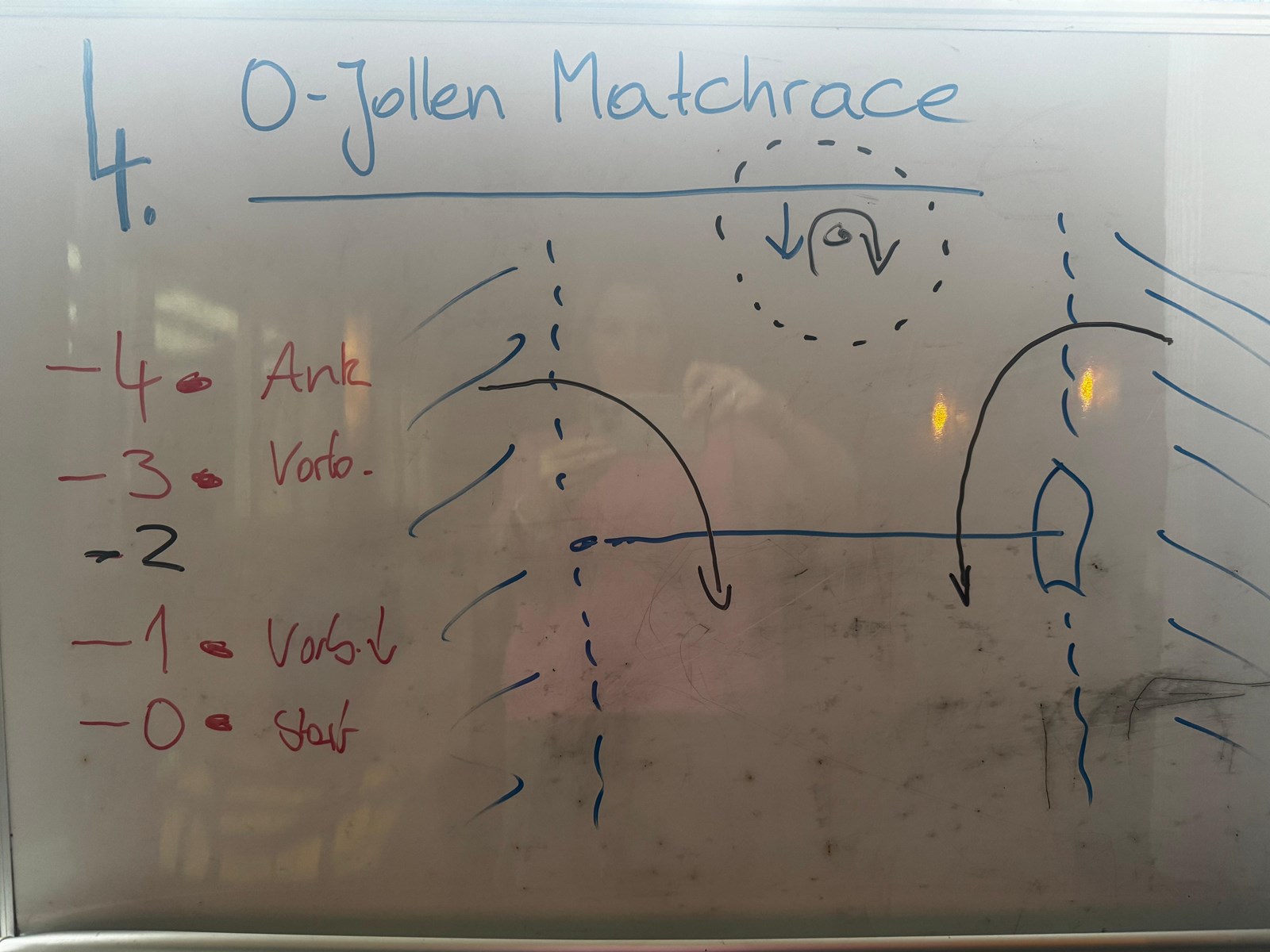 Terug naar het palaver. De wedstrijdleider geeft kort en duidelijk uitleg over de principes van het matchracen. Er blijken toch wel een paar dingen anders te gaan dan bij een fleetrace. er ligt weliswaar een startlijn en een bovenboei en bakboord heeft voorrang maar daar houdt de vergelijking wel op. starten doen we met een waarschuwing op 4 minuten, bij deze waarschuwing moet je op je eigen denkbeeldige helft blijven. De Blauwe boot aan de zijde van het pin-eind en de gele boot aan de zijde van het startschip. Na de 3e minuut mag je richting de startlijn gaan die je bij de 2e minuut moet zijn gepasseerd. Daarna wacht je rustig op het startsein, maar daarover later meer.