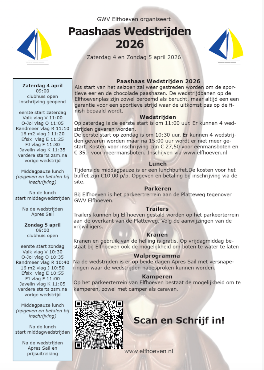 Als start van het seizoen zal weer gestreden worden om de sportieve eer en de chocolade paashazen. De wedstrijdbanen op de Elfhoevenplas zijn zowel beroemd als berucht, maar altijd een een garantie voor een sportieve strijd waar de uitkomst pas op de finish bepaald wordt.