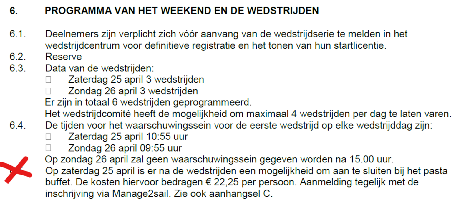 Inschrijven die je via manage to sail, waar onder andere het programma te vinden is. Bij de registratie op zaterdag vanaf 9:30 uur in het clubhuis kun je ook digitaal betalen bij Maarten.