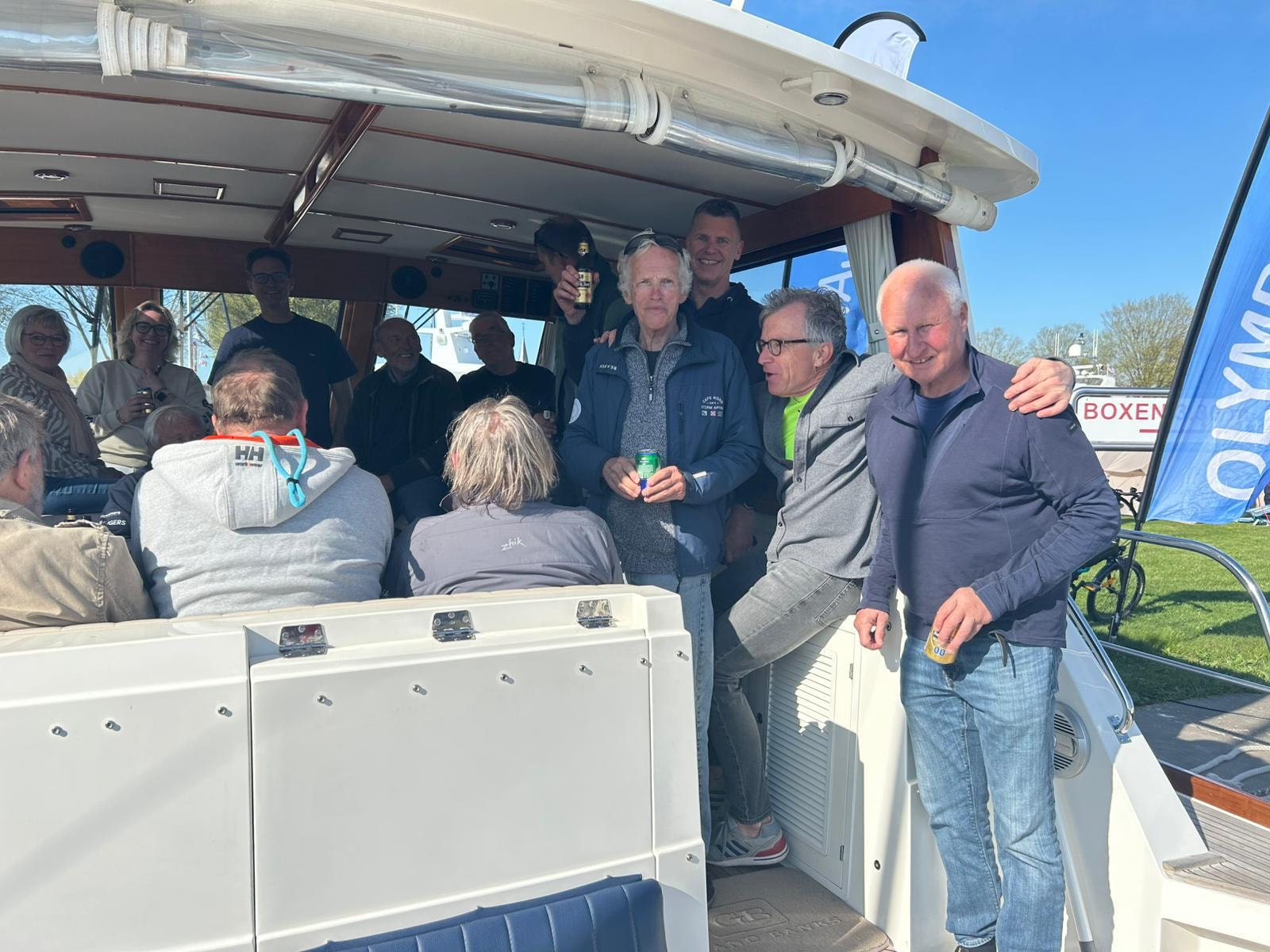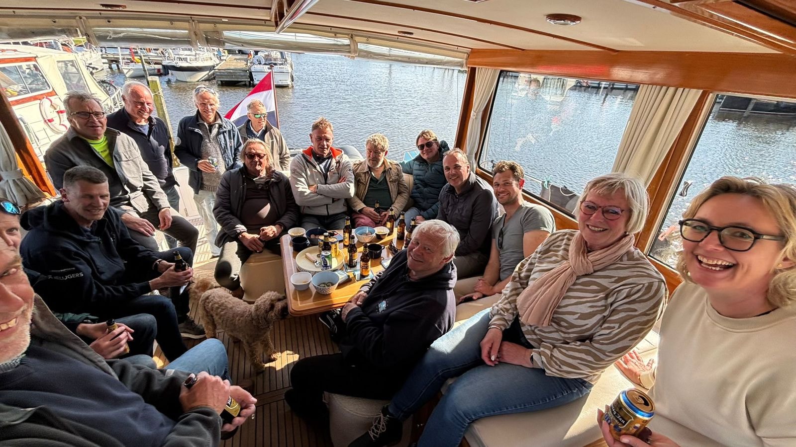 Gelukkig was er op de wal genoeg gelegenheid om met sterke verhalen bij te praten. Maarten en Gabrie verwelkomden ons als vanouds op hun Riverman met drankjes en hapjes. Hans en Willem die zelf niet meezeilden kwamen ook nog even langs. Tenslotte wil je niets missen!